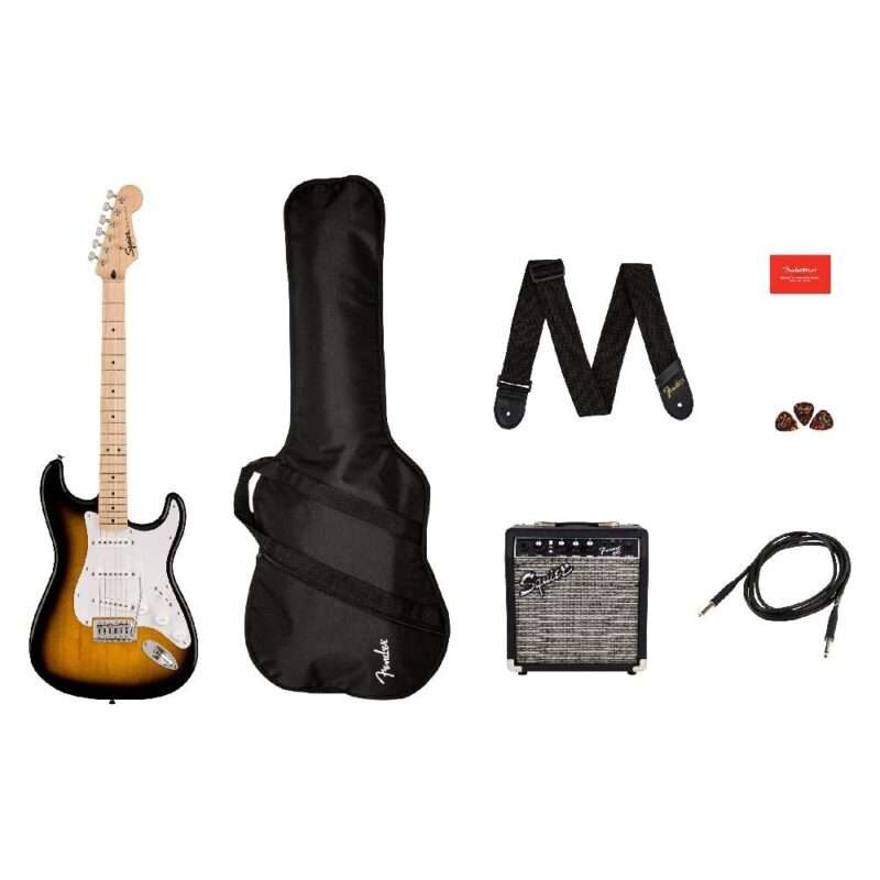 The Squier Sonic® Stratocaster® Pack is ready to launch any musical adventure into warp speed, offering new players a convenient collection of guitar essentials in one box. An icon of music history and a great choice for beginners, the Stratocaster is renowned for its stylish and comfortable contoured body and slim, easy-to-play neck.
