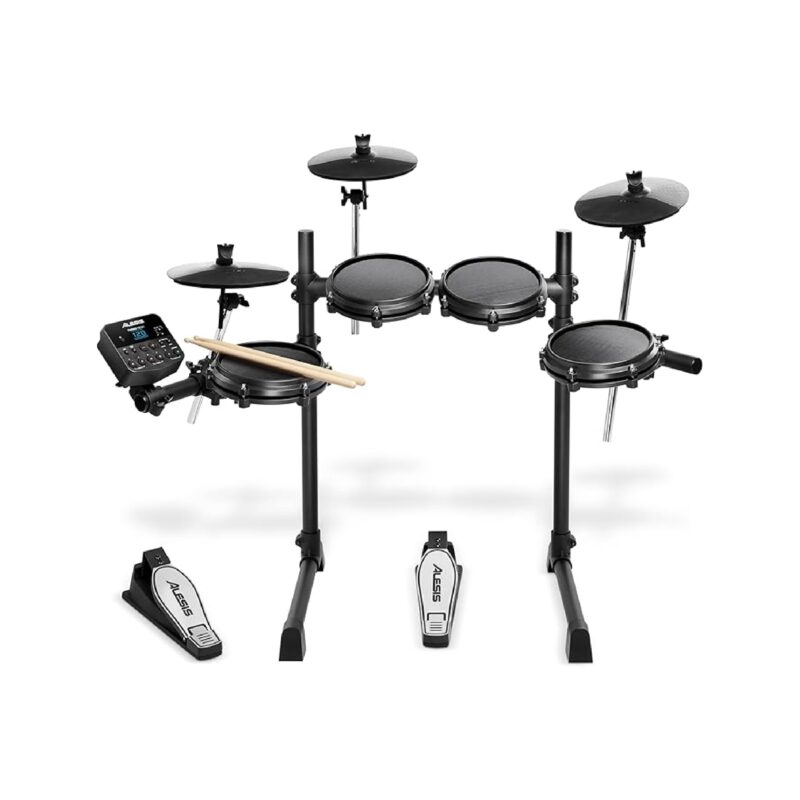 The Alesis Turbo Mesh Kit features an 8″ mesh snare drum and (3) 8″ mesh toms. It includes everything else you need to make a complete drum kit; (3) 10″ cymbals, custom-designed Alesis hi-hat and kick pedals, and a durable steel rack. We also include all the cabling, drum sticks, power supply and a drum key for easy setup, so you can start playing today!